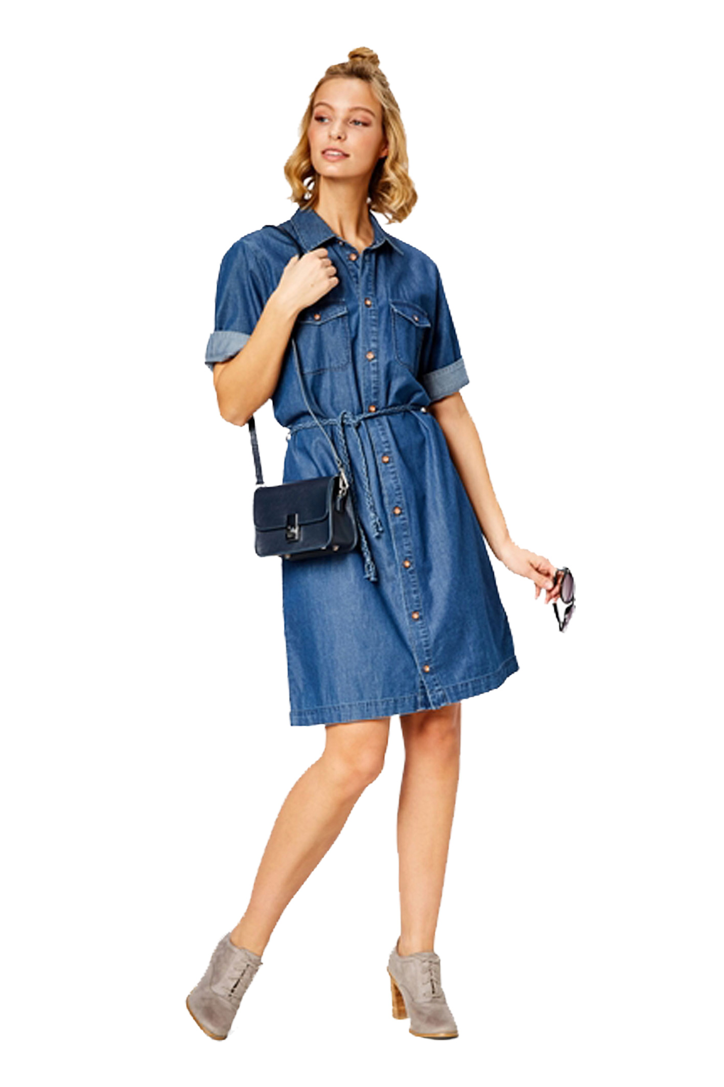 Modisches Damen Jeanskleid auch 100% Baumwolle, durchgeknöpft mit Tailliengürtel in normaler Passform. Ideal für Job und Freizeit